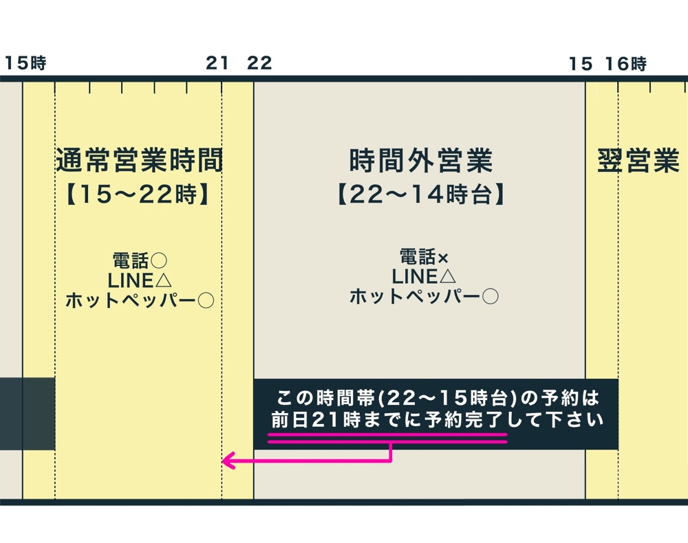 | ✖️ | 22:00〜15:00 ※返答はできません 申請は可能ですが、当日の予約には対応できません |